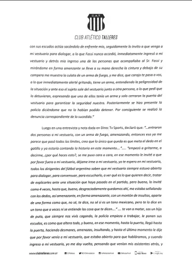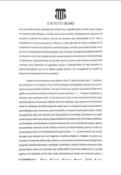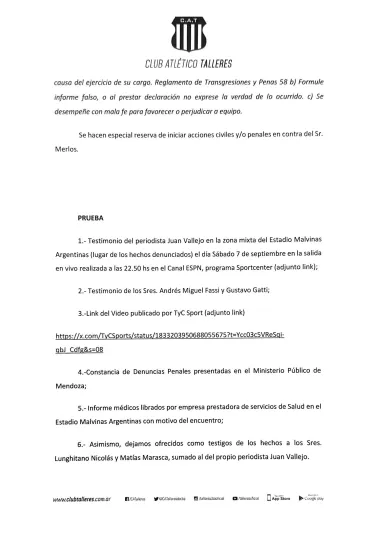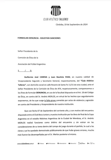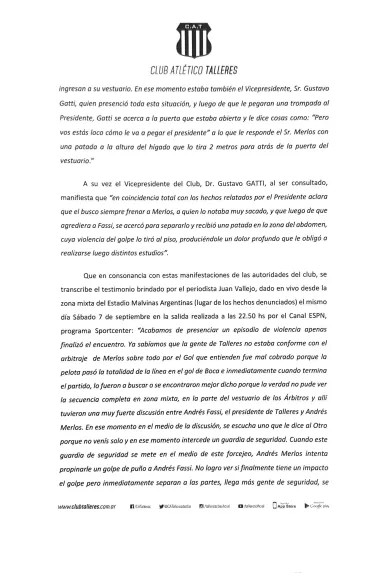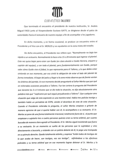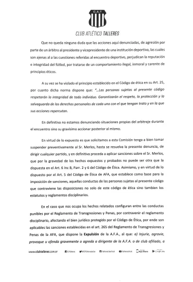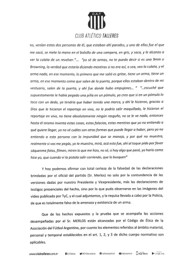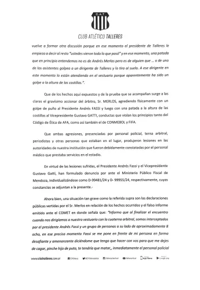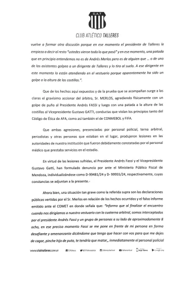 En la denuncia, Talleres resalta que Merlos cometió una falta grave cometida por actos de violencia y agresión hacia el presidente y vicepresidente de la institución, donde resaltan que el árbitro le “pegó una trompada” en el pómulo a Andrés Fassi y una “patada a la altura del hígado” a Gustavo Gatti, vicepresidente de la T.