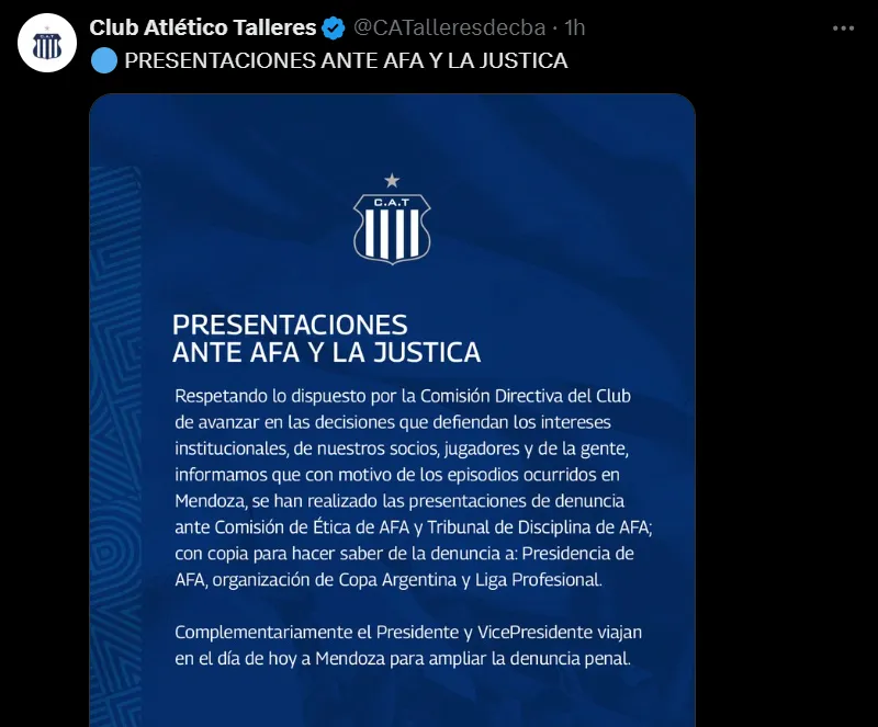 Con su larga denuncia presentada formalmente, Talleres actuó con su versión de los hechos ante AFA y el Comité de Ética y pidió sanciones de gravedad para Andrés Merlos. Quedará en el colegiado enviar -o no- una contraparte con su versión y en el ente nacional de fútbol determinar lo que sucederá con este escandaloso caso entre un árbitro dependiente de AFA y el club cordobés.