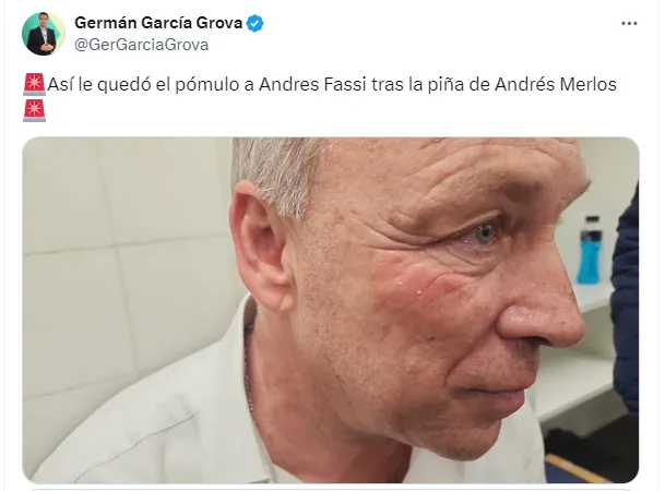 Además, minutos después, el periodista Germán García Grova publicó una foto sobre cómo quedó Andrés Fassi tras la piña que recibió de Merlos, y en la misma se puede ver al presidente de Talleres con su pómulo derecho rojo producto del golpe.
