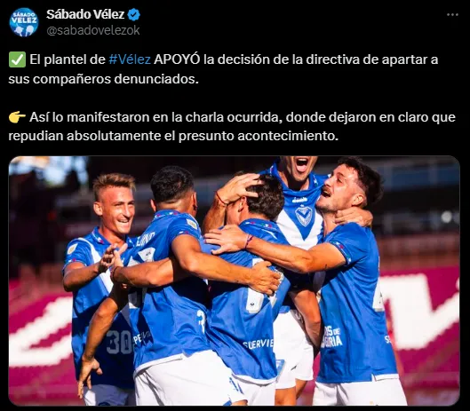 Luego de la decisión del club, confirmada por el propio presidente de la institución, Fabián Berlanga, en las últimas horas trascendió la postura del resto del plantel con los cuatro futbolistas denunciados por abuso. Según informó Sábado Vélez, el pasado viernes hubo una reunión entre todos los jugadores del Fortín y llegaron a un acuerdo para repudiar los hechos por los que son acusados sus compañeros, y apoyaron de manera ferviente el comunicado del club que los sentencia a ser separados futbolísticamente.