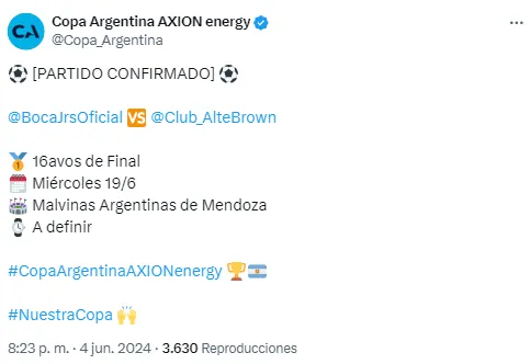 Según informó la cuenta oficial de la red social X de la entidad Xeneize, el partido en cuestión se desarrollará el miércoles 19 de junio en el Estadio Malvinas Argentinas de la provincia de Mendoza. Cabe destacar que el horario de este encuentro todavía no se confirmó y se oficializará recién cuando el juego esté más próximo.