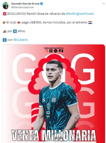 Según adelantaron Germán García Grova, hay acuerdo para que Sosa se ponga la camiseta de Nottingham Forest. El de la Albirroja dará el salto al fútbol inglés tras buenos pasajes en Argentina.