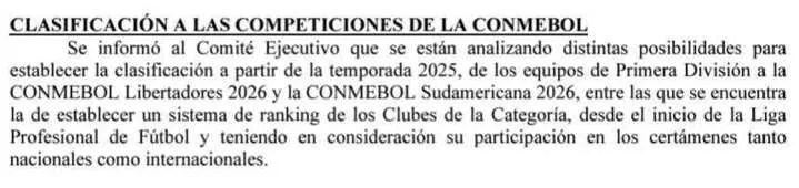 “Clasificación a las competiciones de Conmebol: Se informó al Comité Ejecutivo que se están analizando distintas posibilidades para establecer la clasificación a partir de la temporada 2025, de los equipos de Primera División, a la Conmebol Libertadores 2026 y la Conmebol Sudamericana 2026”, comenzó rezando el comunicado.