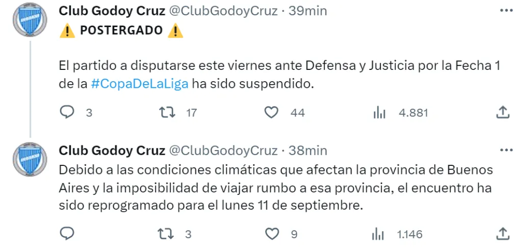 “Debido a las condiciones climáticas que afectan la provincia de Buenos Aires y la imposibilidad de viajar rumbo a esa provincia, el encuentro ha sido reprogramado para el lunes 11 de septiembre”, comunicó el club de Mendoza. De esta manera, hoy no rodará la pelota en Florencio Varela.