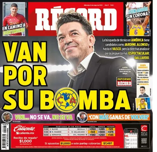 “La búsqueda de técnico en América tiene como candidatos a Jardine, Alonso y hasta el Vasco, pero la directiva analiza ir por la propuesta más espectacular: Gallardo”, dice la portada del reconocido tabloide mexicano. La misión no será sencilla, sobre todo por las aspiraciones del nacido en Merlo para con su futuro profesional, pero el convencimiento se logrará desde el proyecto, tal como lo dijo el propio DT.