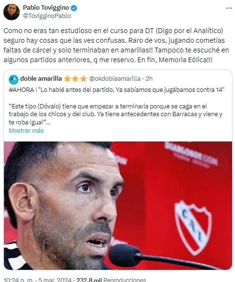 Tras las declaraciones, Pablo Toviggino, tesorero de AFA, salió al cruce del DT con un picante mensaje en X: “Como no eras tan estudioso en el curso para DT (Digo por el Analítico) seguro hay cosas que las ves confusas. Raro de vos, jugando cometías faltas de cárcel y ¡solo terminaban en amarillas! Tampoco te escuché en algunos partidos anteriores, que me reservo. En fin, memoria eólica“.