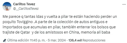 Sin filtro, y continuando con las acusaciones personales, el Apache disparó desde su cuenta: “Me parece que tantas idas y vuelta a Pilar te están haciendo perder un poquito, Toviggino. Aparte de la colección de autos antiguos e importados que acumulás en pilar, también enterrar los bolsos que trajiste de Qatar y de los amistosos en China. Memoria, Alí Babá“.
