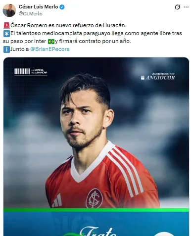 Según la información de César Luis Merlo y Brian Pécora, el volante ofensivo llegó a un acuerdo con el Globo para sumarse por un año con el pase en su poder tras finalizar su contrato con Internacional de Porto Alegre. Detrás de Racing, San Lorenzo y Boca Juniors, Huracán será el cuarto equipo de Romero en Argentina.