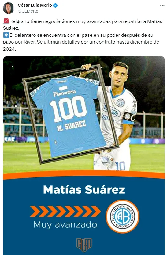 Según la información César Luis Merlo de este miércoles, Belgrano y Suárez están a detalles de concretar un tercer ciclo juntos. Como jugador libre, el ex Anderlecht firmaría contrato hasta diciembre del 2024 y jugaría la Copa Sudamericana con el equipo cordobés.