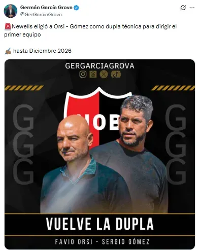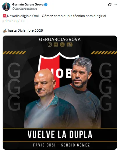 Según adelantó Germán García Grova, la dupla campeona del fútbol argentino en el primer semestre es la elegida por la dirigencia de Newell’s Old Boys para hacerse cargo del equipo en 2026. Así, Orsi-Gómez tomarán las riendas del plantel que estuvo bajo las órdenes del Ogro Fabbiani.