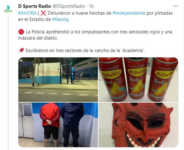 Según se avanzó desde Doble Amarilla, el grupo realizó pintadas obscenas en tres sectores diferentes del estadio de La Academia que recibirá el clásico de Avellaneda. “Personal del Gabinete Técnico Operativo de la Policía de la Provincia de Buenos Aires rastrilló la zona y encontró en las calles Palaa y Lavalle a nueve masculinos y una femenina con tres aerosoles de color rojo y una máscara de diablo“.