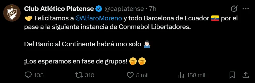 A través de cuenta de X, Platense compartió: “Felicitamos a Carlos Alfaro Moreno y a todo Barcelona de Ecuador por el pase a la siguiente instancia de la Copa Libertadores. Del Barrio al Continente habrá uno solo. ¡Los esperamos en la fase de grupos!”