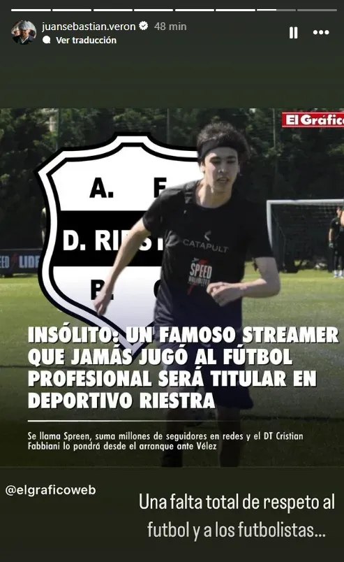 La presencia del influencer no solo generó memes y chistes en redes sociales, sino también indignación por haber utilizado a una celebridad para disputar un partido de fútbol profesional. Entre los enojados apareció Juan Sebastián Verón, uno de los grandes críticos del momento que atraviesa la Liga Profesional, y no tuvo filtros para hablar al respecto.