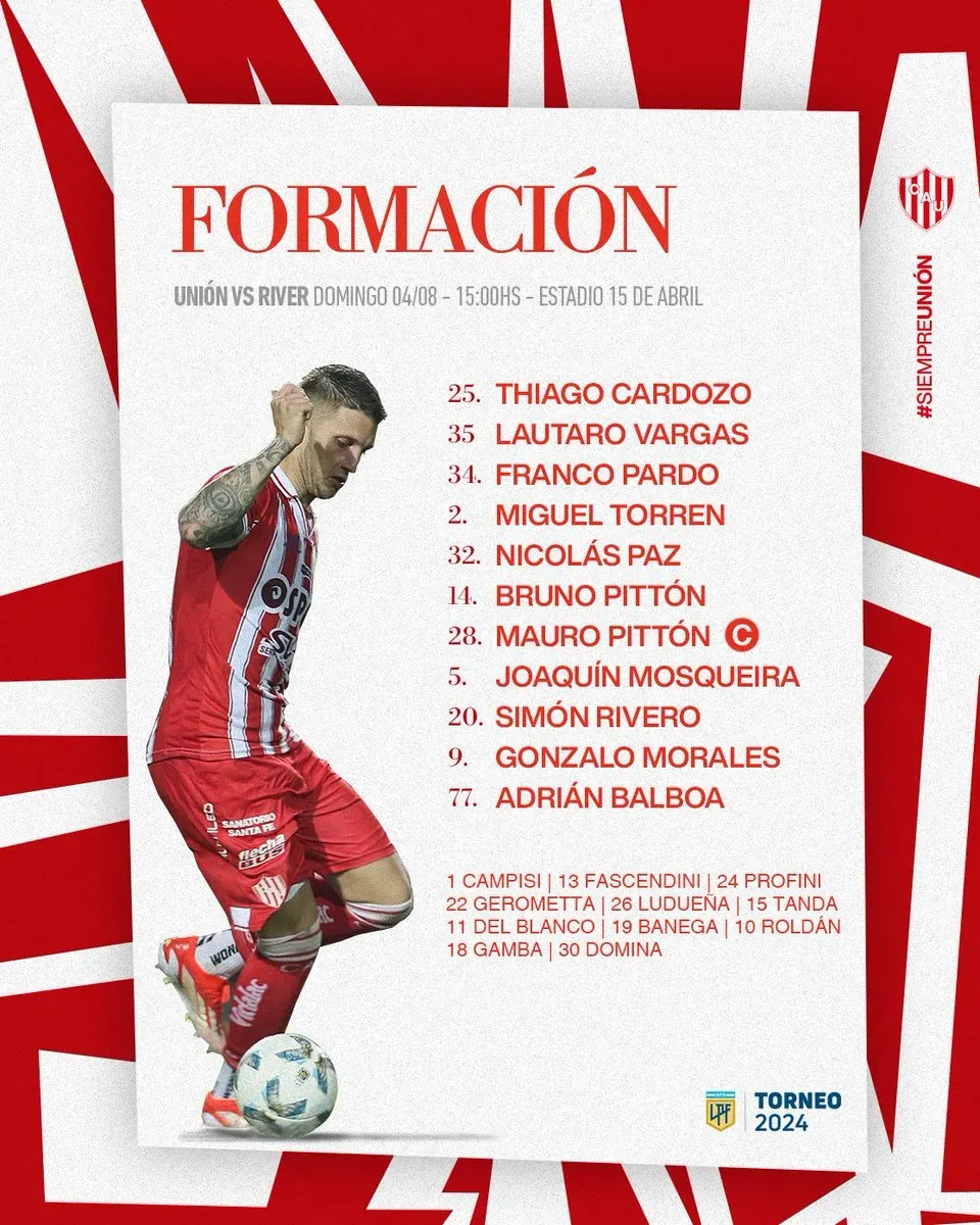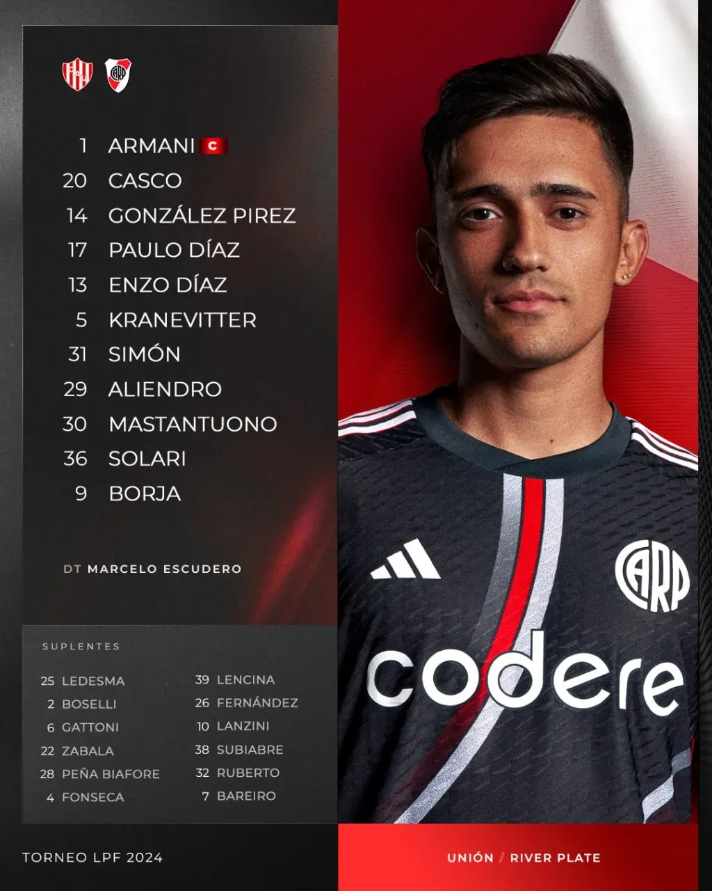 A falta de poco más de hora y media para el partido, el Millonario no tiene equipo confirmado. Sin embargo, Marcelo Escudero planteó entresemana diversos once iniciales, por lo que la formación ante Unión no saldría de estos nombres, que guarden algunas dudas: Franco Armani; Milton Casco o Santiago Simón, Leandro González Pirez, Paulo Díaz, Enzo Díaz; Felipe Peña Biafore, Nacho Fernández, Franco Mastantuono, Manuel Lanzini o Rodrigo Aliendro; Pablo Solari y Miguel Borja.