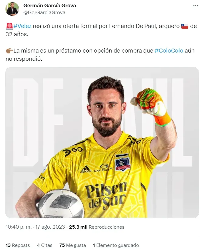 A Liniers ya llegaron Elías Gómez, Braian Romero, Francisco Pizzini, Claudio Aquino y Yeison Gordillo. Ahora, la idea del Gallego Méndez es sumar una cara nueva en el arco y ya hay un apuntado que está jugando en el exterior: Fernando de Paul, de Colo Colo.
