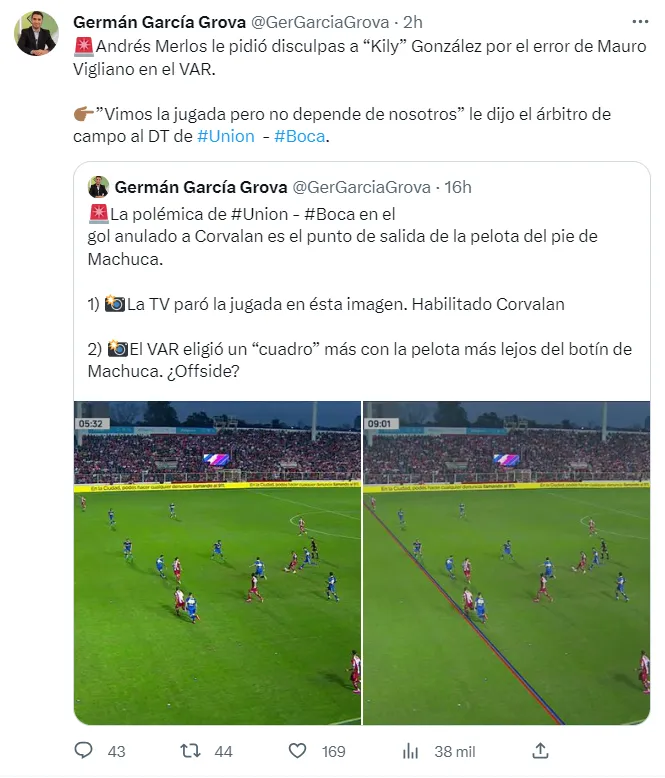 Según informó el periodista Germán García Grova, el árbitro fue al vestuario local y le pidió disculpas al entrenador, reconociendo que hubo un error de Vigliano. ”Vimos la jugada pero no depende de nosotros”, fue lo que le dijo el colegiado al Kily, que se había mostrado furioso en conferencia.
