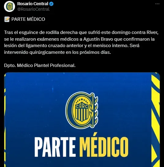 “Tras el esguince de rodilla derecha que sufrió este domingo contra River, se le realizaron exámenes médicos a Agustín Bravo que confirmaron la lesión del ligamento cruzado anterior y el menisco interno. Será intervenido quirúrgicamente en los próximos días“, comunicó formalmente Rosario Central en sus redes sociales.