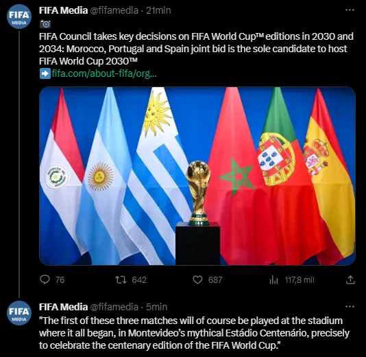 “En un mundo dividido, la FIFA y el fútbol se están uniendo“, afirmó el Presidente de la FIFA, Gianni Infantino. “El Consejo de la FIFA, en representación de todo el mundo del fútbol, acordó por unanimidad celebrar el centenario de la Copa Mundial de la FIFA, cuya primera edición se jugó en Uruguay en 1930, de la manera más apropiada. Como resultado, habrá una celebración en Sudamérica y tres países sudamericanos (Uruguay, Argentina y Paraguay) organizarán cada uno un partido de la Copa Mundial de la FIFA 2030. El primero de estos tres partidos, por supuesto, se jugará en el estadio. donde empezó todo, en el mítico Estádio Centenário de Montevideo, precisamente para celebrar la edición centenaria de la Copa Mundial de la FIFA”.