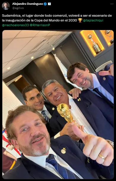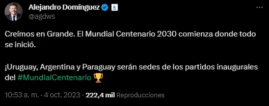 “Creímos en Grande. El Mundial Centenario 2030 comienza donde todo se inició. ¡Uruguay, Argentina y Paraguay serán sedes de los partidos inaugurales!“, expresó Domínguez en sus redes sociales. De esta forma, se confirmó que los primeros partidos de la Copa del Mundo del 2030 se disputarán en suelo sudamericano.