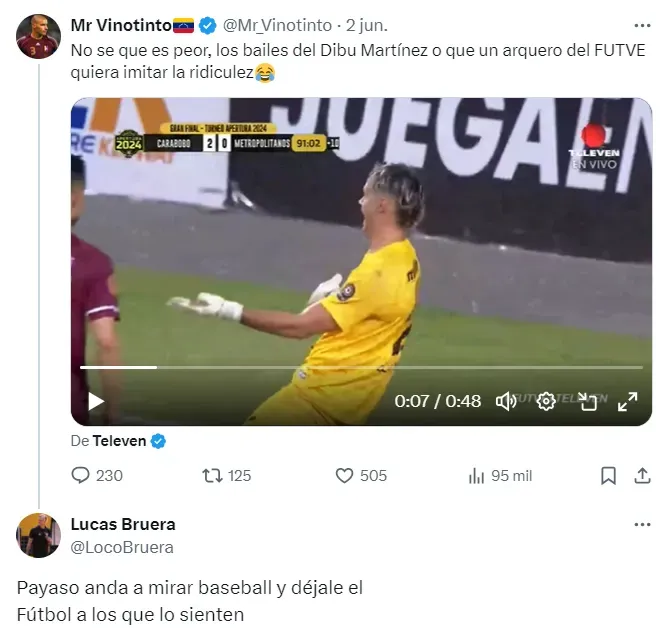 Incluso, uno de ellos, disparó: “No sé qué es peor, los bailes del Dibu Martínez o que un arquero del FUTVE quiera imitar la ridiculez“. Y la respuesta no tardó en llegar. A través de su cuenta, Bruera le comentó: “Payaso andá a mirar baseball y dejale el fútbol a los que lo sienten“.