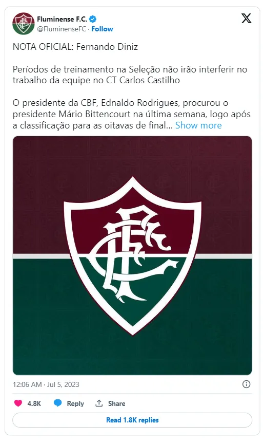 Ante la fuerte repercusión que tuvo la noticia en el país vecino, el propio Flu sacó un comunicado para calmar las aguas. “El apoyo a la Selección no tendría impacto en la rutina del equipo, incluso porque la dedicación del entrenador sólo sería en los períodos FIFA. fechas y no en su totalidad. Los periodos de entrenamiento de la Selección son muy cortos y, debido a la paralización de los campeonatos por fechas FIFA, no interferirán con el trabajo en el CT Carlos Castilho”, marca el escrito de la institución.
