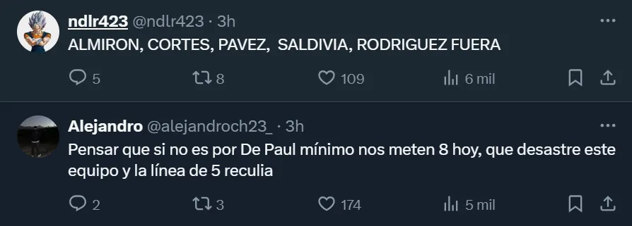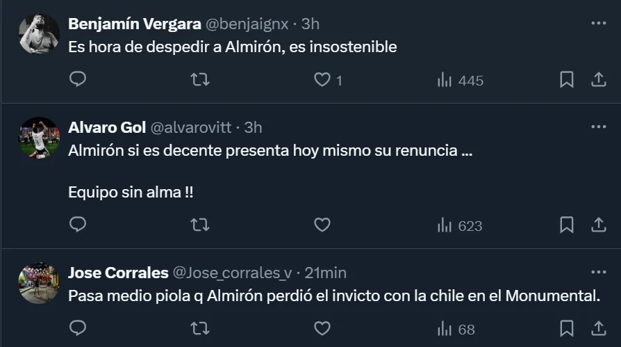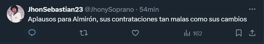 Por medio de las redes sociales, y en medio de los rumores de una posible salida del ex entrenador de San Lorenzo, Independiente y Boca, los aficionados se mostraron muy molestos, y le soltaron la mano. Sí, a pesar de que en 2024 logró dos títulos. Y pidieron por su salida. “Es hora de despedir a Almirón, es insostenible”, esbozó el @benjaignx, uno de los tantos hinchas del Cacique que, en Twitter, se mostró enojado con el presente deportivo.