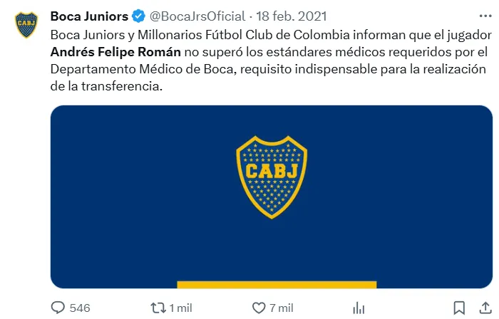 Este reciente episodio revivió un triste recuerdo para Andrés Felipe Román: cuando se cayó su pase a Boca Juniors tras no superar la revisión médica. A comienzos de 2021, el colombiano estaba en Buenos Aires a punto de convertirse en refuerzo del Xeneize, pero la chance se esfumó luego de que le detectaran una anomalía cardíaca.