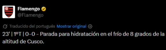 Sin ir más lejos, en esta primera fecha de la fase de grupos de la Copa Libertadores, Flamengo se quejó abiertamente a través de su cuenta de X. El Mengao visitó a Cusco en Perú y en sus redes sociales publicó: “Para para hidratación en el frío de 8 grados de la altitud de Cusco”.