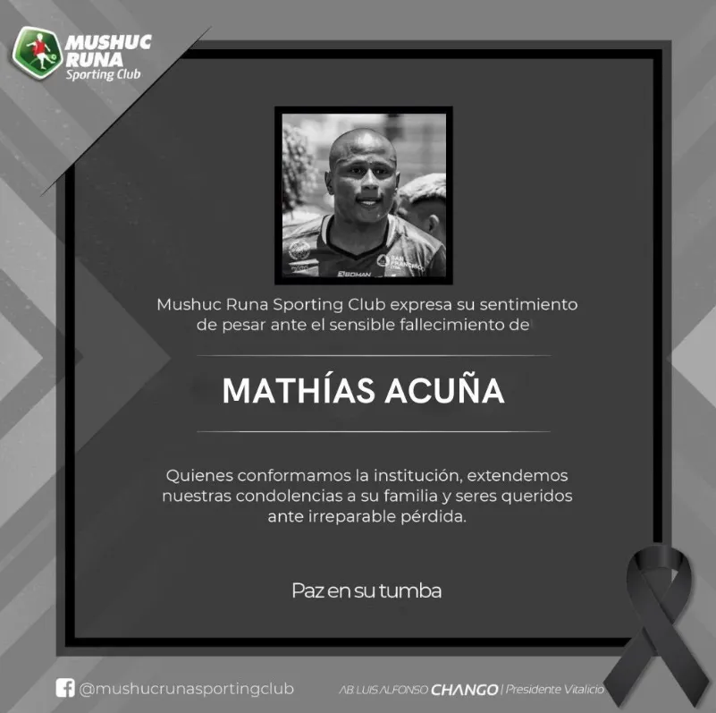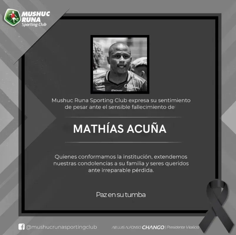 “Extendemos nuestra nota de pesar ante el sensible fallecimiento de Mathías Acuña. Paz en su tumba”, compartió Mushuc Runa en sus redes sociales. Por su parte, la AUF, se manifestó en X: “Lamentamos con profunda tristeza el fallecimiento del futbolista uruguayo Mathías Acuña. Nuestras condolencias a sus familiares, compañeros y amigos”.