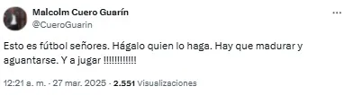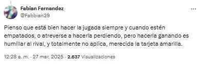 Tras el encuentro, Villarreal se refirió a su acción sobre el césped y defendió su comportamiento: “La verdad no entendí la amarilla, creo que son cosas del futbol y hace del fútbol algo más divertido”.