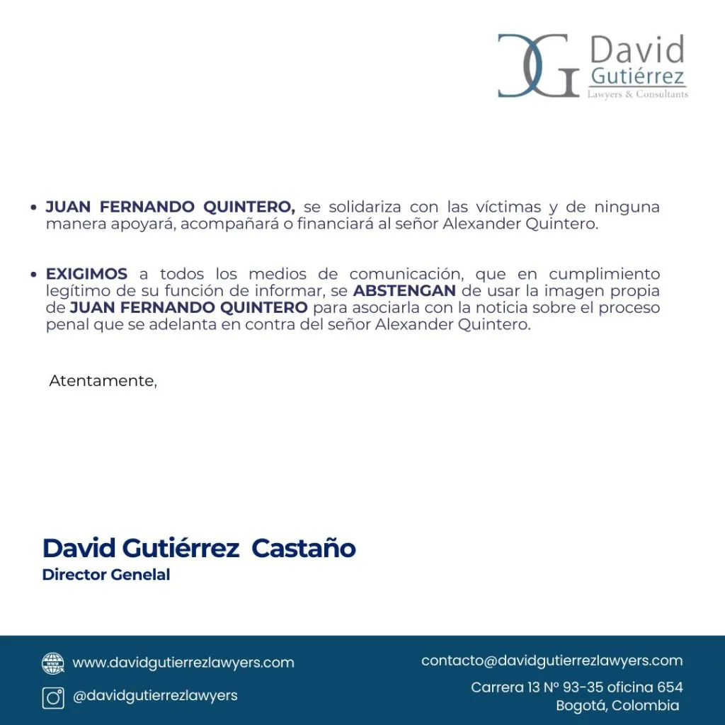 “Juan Fernando Quintero se solidariza con las víctimas y de ninguna manera apoyará, acompañará o financiará al señor Alexander Quintero. Exigimos a todos los medios de comunicación, que en cumplimiento legítimo de su función, se abstengan de usar la imagen propia de Juan Fernando Quintero para asociarla con la noticia sobre el proceso penal que se adelanta en contra del señor Alexander Quintero”.