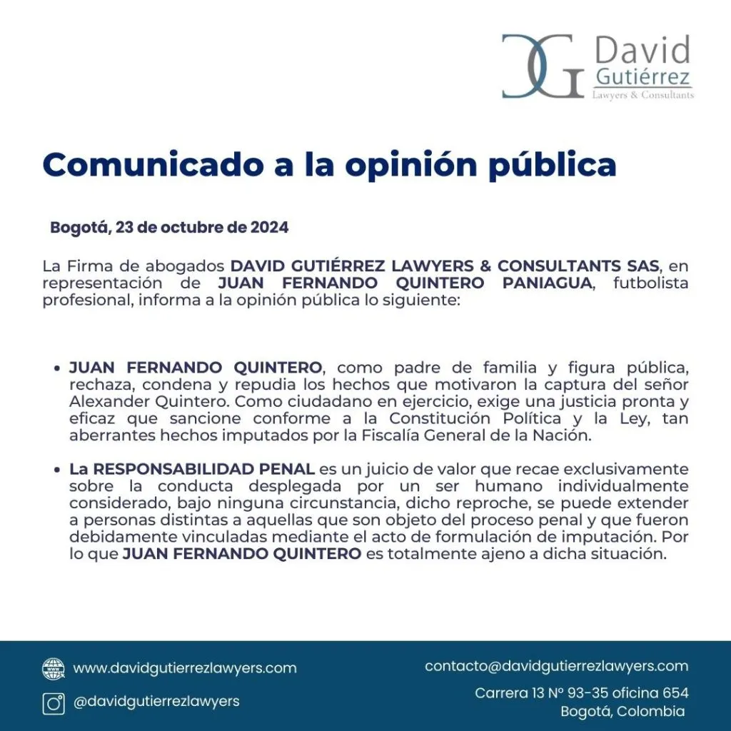 “Juan Fernando Quintero, como padre de familia y figura pública, rechaza, condena y repudia los hechos que motivaron la captura del señor Alexander Quintero. Como ciudadano en ejercicio, exige una justicia pronta y eficaz que sancione conforme a la Constitución Política y la Ley, tan aberrantes hechos imputados por la Fiscalía General de la Nación”.