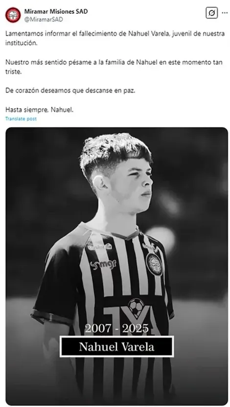 “Con profunda tristeza tenemos que informar el fallecimiento de Nahuel Varela, juvenil cebrita. Nuestro más sentido pésame a su familia, amigos e integrantes del plantel generación 2007 en este momento tan doloroso”, exteriorizó Miramar Misiones.