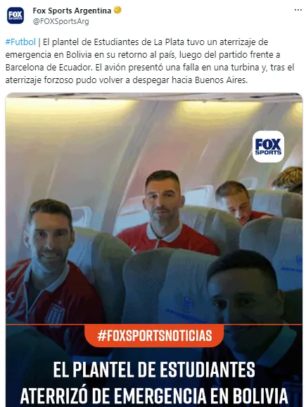Este martes, Estudiantes de La Plata cayó 2-1 en su visita a Barcelona de Guayaquil por los dieciseisavos de final de la Copa Sudamericana pese a jugar un buen partido en el que mereció tener mejor suerte. Y esa mala fortuna que no le permitió volver con un empate para definir con más holgura la serie como local lo acompañó también durante el vuelo de regreso.