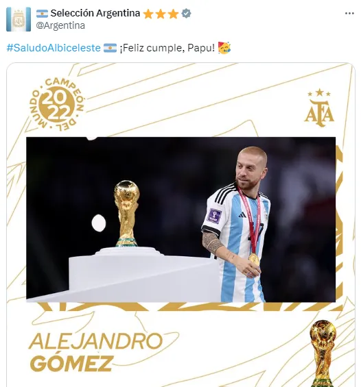 “¡Feliz cumple, Papu!”, escribió la cuenta oficial de la Selección Argentina en X (antes Twitter) para saludar a Alejandro Gómez por un nuevo aniversario de su nacimiento. Hasta ahora, no hubo respuesta por parte del futbolista.