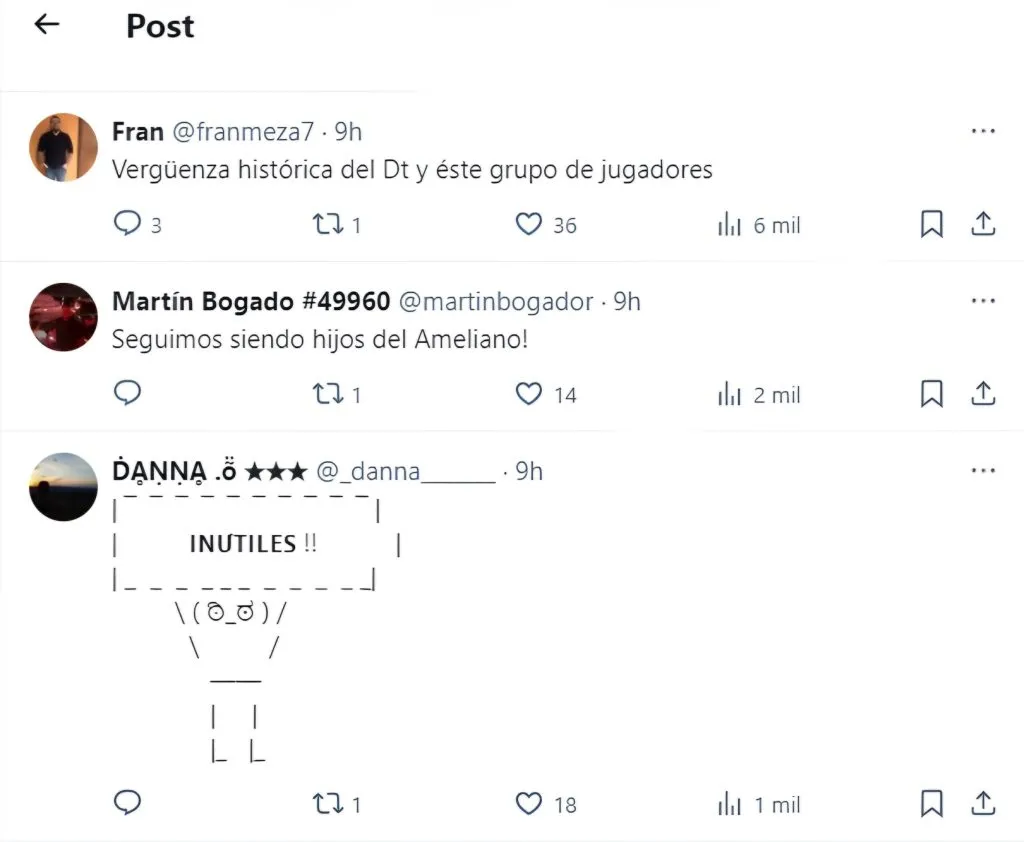 Apenas finalizado el encuentro, el malestar de los hinchas de Olimpia por la temprana eliminación en Copa Sudamericana no tardó en plasmarse en las redes sociales oficiales del club. “La peor presentación internacional de Olimpia en toda su historia”, manifestó uno de ellos. “Vergüenza histórica del DT y este grupo de jugadores”, agregó otro. “Se puede perder, esto es fútbol, pero jamás perder como perdieron hoy. Se jugaban el año. Horribles, sin ganas”, acotó un tercero.