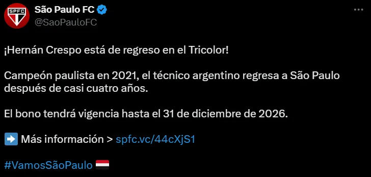 Sao Paulo ya anunció a su reemplazante y también es argentino. Se trata de Hernán Crespo, quien ya dirigió al club en 2021. En aquella oportunidad ganó al Campeonato Paulista, tuvo un discreto Brasilerao y llegó a los cuartos de final de la Copa Libertadores en la que quedó eliminado ante Palmeiras. Después de esa experiencia, Valdanito pasó por Al-Duhail de Qatar y por Al-Ain de Emiratos Árabes Unidos.