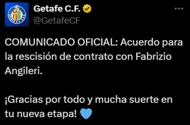 A través de sus redes sociales, Getafe comunicó oficialmente que se rescindió el contrato de Fabrizio Angileri y los mensajes de los hinchas fueron lapidarios. Algunos lo catalogaron como uno de los peores refuerzos del equipo y otros fueron algo más hirientes al tildarlo de parásito. La realidad es que el ex River no funcionó y prácticamente no tuvo participación importante.