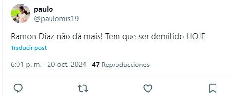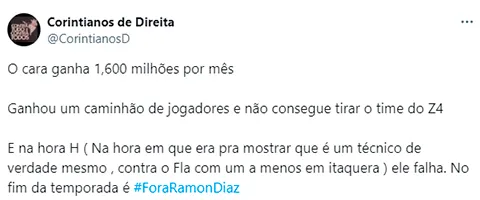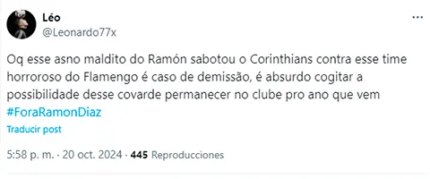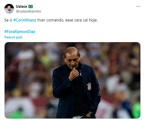 “¡Ramón Díaz ya no puede más! Tiene que ser despedido HOY”, se quejó un hincha desde las redes sociales. “Parece que es el Corinthians el que tiene un jugador menos. Tanta desorganización”, protestó otro. “Es el peor técnico de Brasil”, sentenció un tercero. “Siempre he dicho que ese entrenador es débil, pero ahora es lo que tenemos”, señaló uno más. “Saboteó al Corinthians”, manifestó otro.