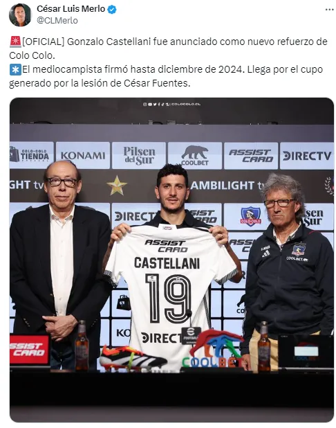 Este miércoles, Colo Colo oficializó el fichaje de Gonzalo Castellani, que se encontraba en la bolsa de agentes libres tras su paso por Defensa y Justicia. El mediocampista de 36 años afrontará su segundo ciclo en el fútbol chileno tras haber defendido los colores de Unión La Calera entre 2020 y 2022.