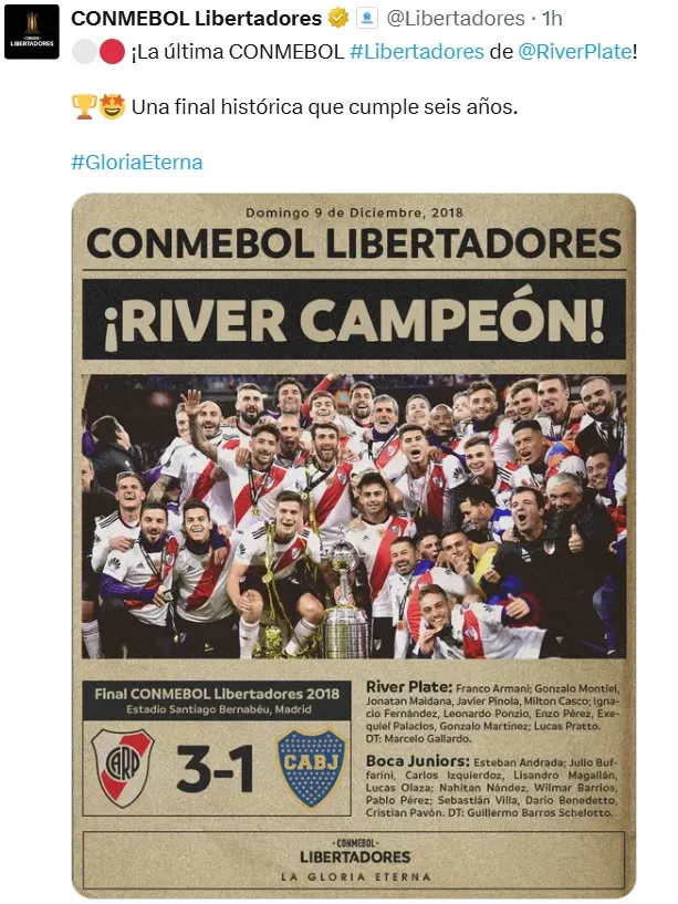 A través de su cuenta de X de la Libertadores, la Conmebol rememoró lo vivido en Madrid y saludó al pueblo riverplatense. Con una imagen que emulaba a un diario con la fecha 9/12/2018, una foto de la consagración y las formaciones de los equipos, la casa madre del fútbol sudamericano publicó: “¡La última Conmebol Libertadores de River Plate! Una final histórica que cumple seis años. Gloria eterna”.