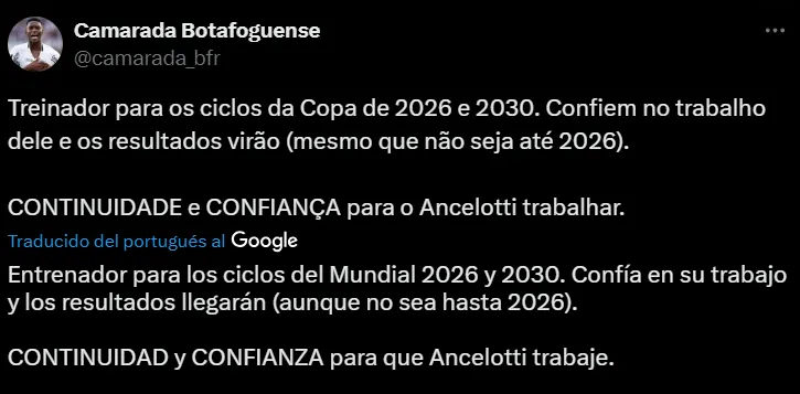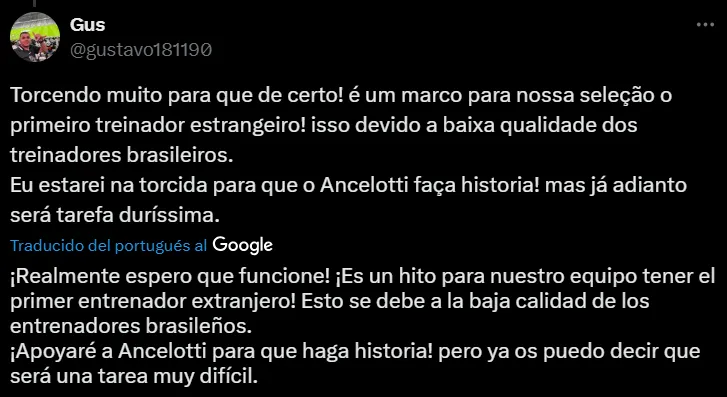 Además, dentro de los mensajes, muchos fanáticos aprovecharon para criticar a la Confederación Brasileña de Fútbol (CBF), debido a que afirmaron que a los entrenadores anteriores les obligaban a citar a determinados jugadores y pidieron que con Ancelotti esto no ocurra.
