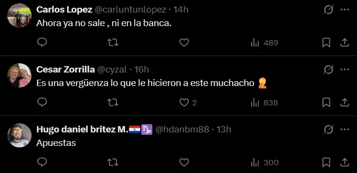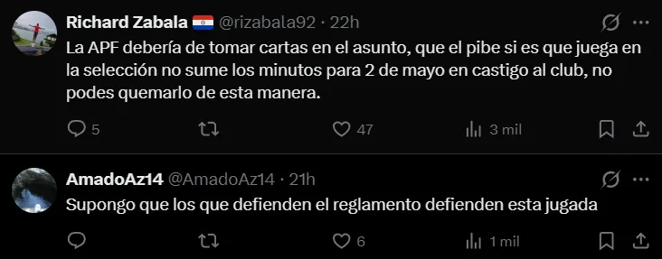Incluso después de las explicaciones que dio Antoniel Armoa, las críticas a 2 de Mayo y a su entrenador siguieron llegando de parte de quienes consideraron que no se debía exponer a un juvenil a una situación así: “Es una vergüenza lo que le hicieron a este muchacho”, escribió un usuario de X. “Ahora ya no sale ni en la banca”, lanzó otro como predicción. “La APF debería de tomar cartas en el asunto, que el pibe si es que juega en la selección no sume los minutos para 2 de Mayo en castigo al club, no podes quemarlo de esta manera”, señaló un tercero. “Supongo que los que defienden el reglamento defienden esta jugada”, expresó uno más.