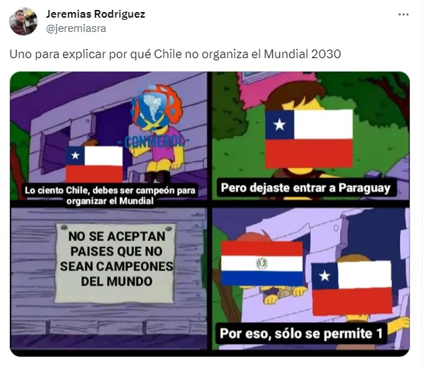 Inmediatamente, las redes sociales se inundaron de memes contra Chile por haber sido desplazados de la organización del Mundial 2030 hasta nuevo aviso, según lo informó Alejandro Domínguez.