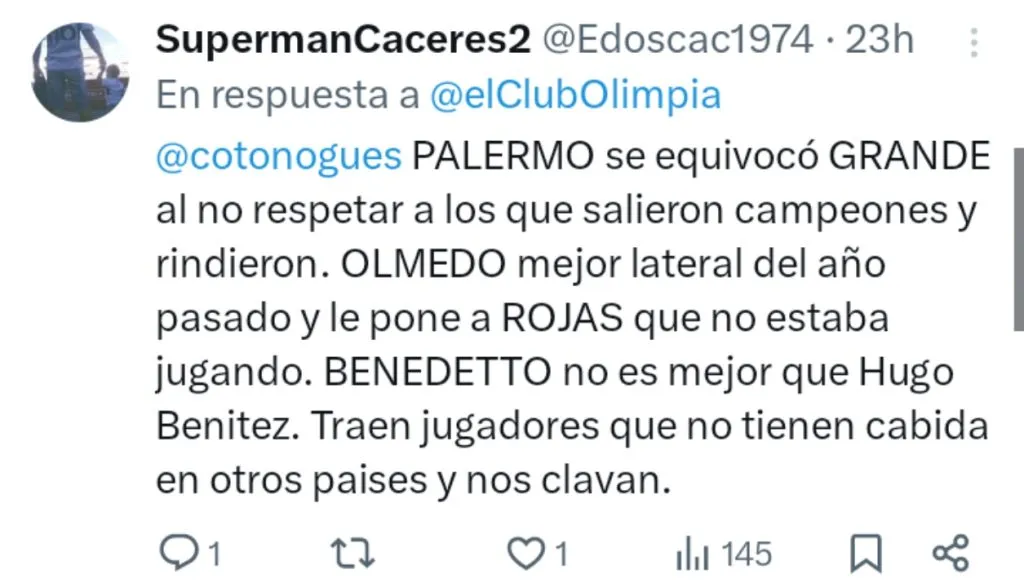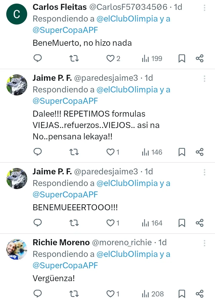 “BeneMuerto no hizo nada”, se quejó uno de ellos rebautizando al exdelantero de Boca. “Repetimos fórmulas viejas, refuerzos viejos. Así no”, advirtió otro. “Vergüenza”, sentenció un tercero. “Palermo se equivocó grande al no respetar a los que salieron campeones. Benedetto no es mejor que Hugo Benítez. Traen jugadores que no tienen cabida en otros países y nos clavan”, protestó uno más.