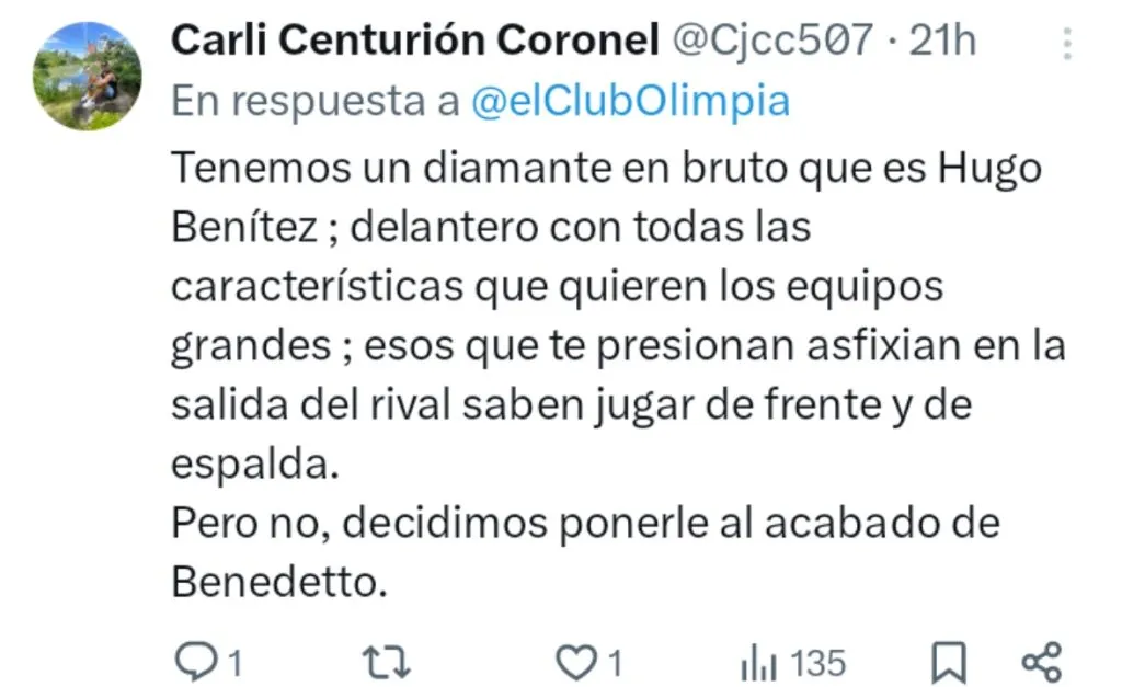 Fue precisamente cuando el club informó en sus redes sociales la salida de Benedetto para dar lugar al ingreso del delantero de 21 años Hugo Benítez que se hicieron visibles las primeras opiniones sobre su rendimiento y las primeras críticas a Martín Palermo por haberle dado la titularidad “por nombre” y no por actualidad.