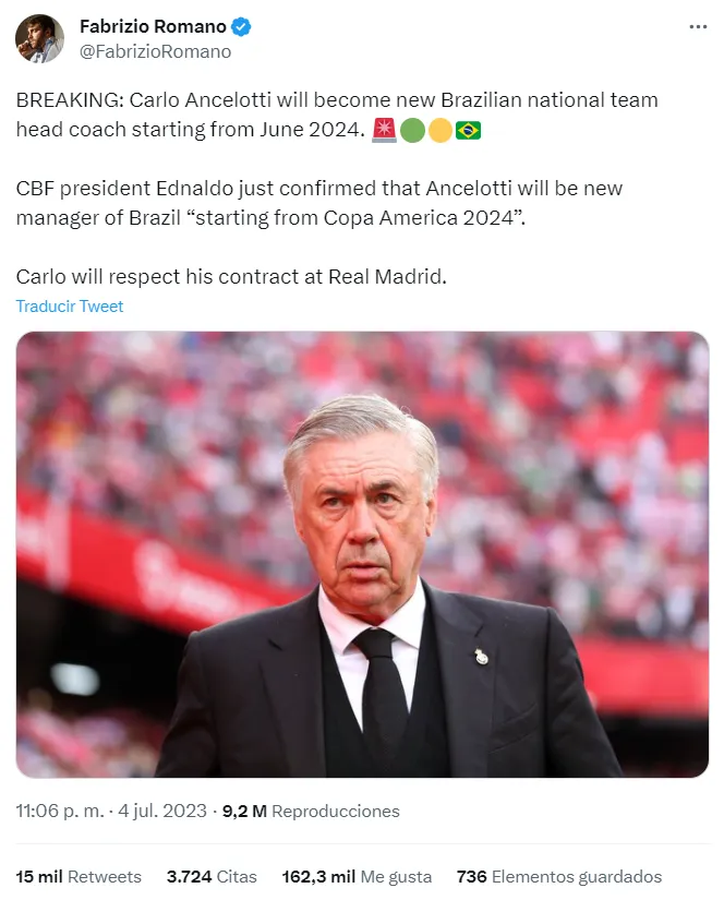 Ednaldo, presidente de la CBF, confirmó que quien se hará cargo será nada más ni nada menos que Carlo Ancelotti. El italiano cumplirá su contrato con el Real Madrid y dirigirá a la Canarinha a partir de la Copa América 2024. Sin lugar a dudas, un hecho histórico para el fútbol brasilero, que tendrá un técnico del exterior.