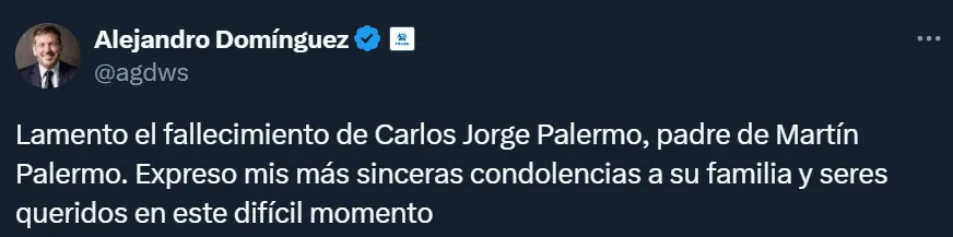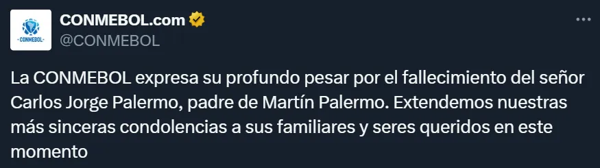 Quien también aprovechó el uso de las redes sociales para mostrarse cerca del ex delantero de Estudiantes de La Plata fue Alejandro Domínguez, el actual presidente de la Confederación Sudamericana de Fútbol, quien envió su pésame: “Lamento el fallecimiento de Carlos Jorge Palermo, padre de Martín Palermo. Expreso mis más sinceras condolencias a su familia y seres queridos en este difícil momento”, indicó a través de Twitter.