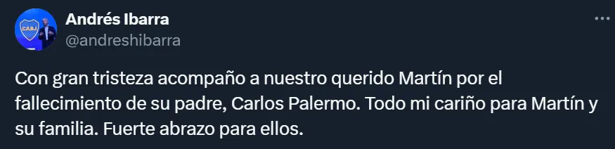 Al nacido en La Plata no solo lo están acompañando desde el Expreso Decano y el club en donde se transformó en el máximo goleador de la historia, sino que también desde CONMEBOL y algunas personalidades del mundo azul y oro, donde fue Andrés Ibarra, ex candidato a presidente, quien se manifestó por medio de su cuenta de Twitter. “Con gran tristeza acompaño a nuestro querido Martín por el fallecimiento de su padre, Carlos Palermo. Todo mi cariño para Martín y su familia. Fuerte abrazo para ellos”, exclamó el ex ministro de Modernización de la Nación Argentina.