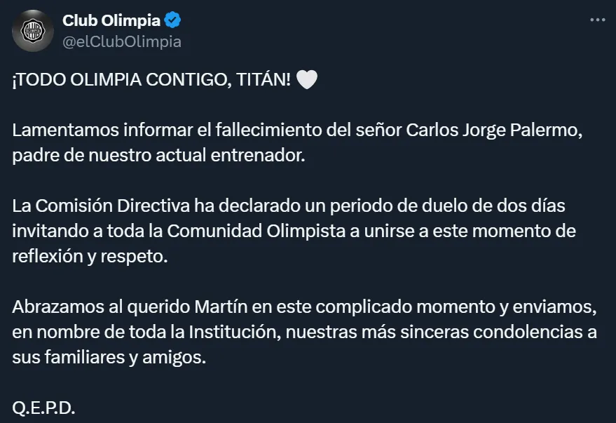 “Lamentamos informar el fallecimiento del señor Carlos Jorge Palermo, padre de nuestro actual entrenador. La Comisión Directiva ha declarado un periodo de duelo de dos días invitando a toda la Comunidad Olimpista a unirse a este momento de reflexión y respeto. Abrazamos al querido Martín en este complicado momento y enviamos, en nombre de toda la Institución, nuestras más sinceras condolencias a sus familiares y amigos”, fue el comunicado que emitió el club paraguayo para acompañar a su estratega.